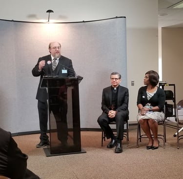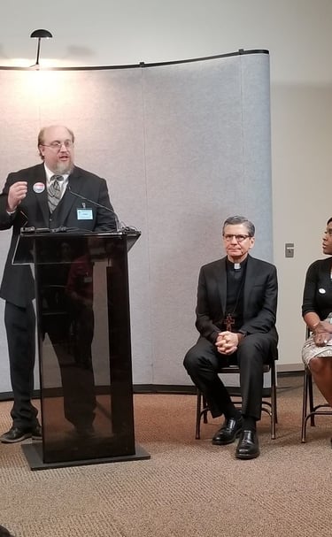 Speaking up for justice with other faith leaders as part of COPS/Metro organizing collective in San Antonio. The Archbishop of San Antonio is seated to the right of me.