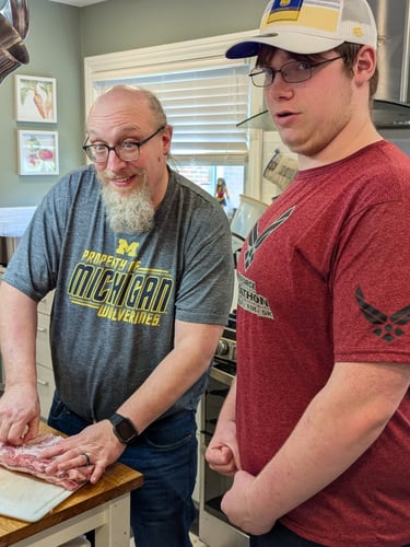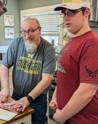 With my youngest son Matthew preparing his favorite thing to eat: BBQ ribs. I have some growing boys.