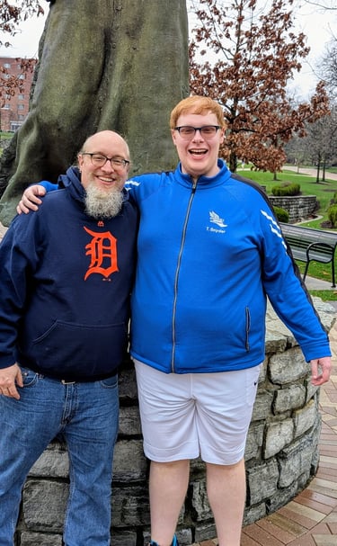 Posing with my eldest son Thomas at the University of Dayton, where he is a sophomore.